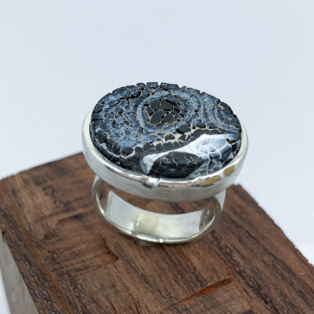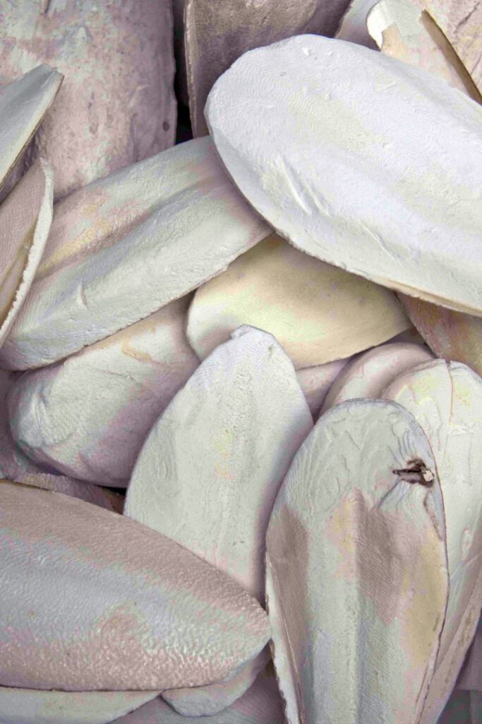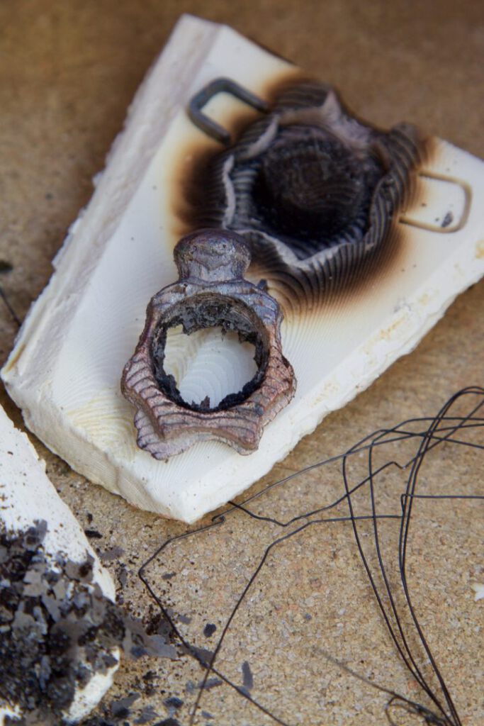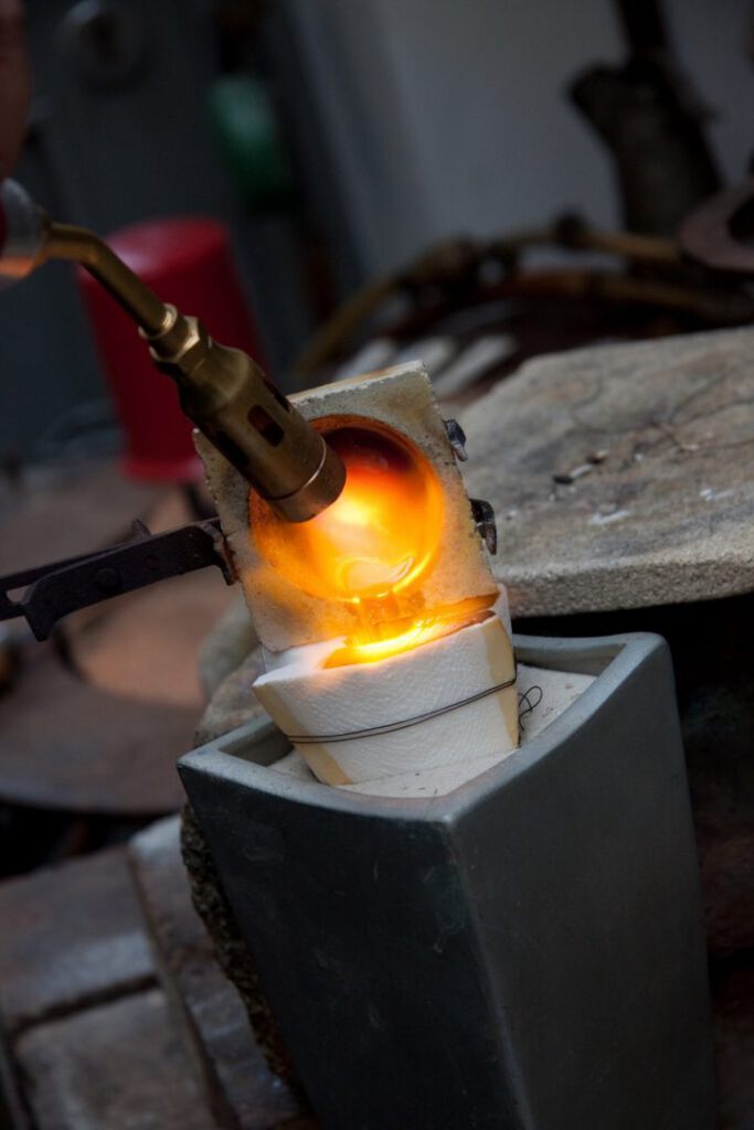 Es ist eine sehr spannende und eigentlich preiswerte Methode des Gießens. In der Schmuckgestaltung wird sie seit mehreren Tausend Jahren genutzt. Wir benötigen dafür den Rückenschulp vom Tintenfisch. Dieser kalkhaltige Knochen dient als Negativ-Form um geschmolzenes Gold oder Silber dort hinein zu gießen. Am Ende drückt sich die Struktur des jeweiligen Schulps im Edelmetall ab. Das Resultat ist jedes Mal ein Unikat- denn keine Schale gleicht einer anderen..